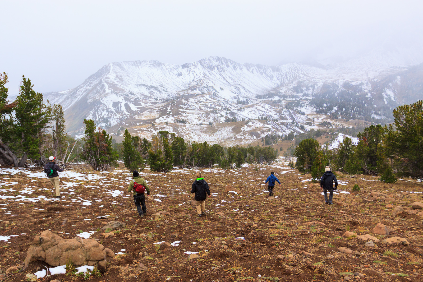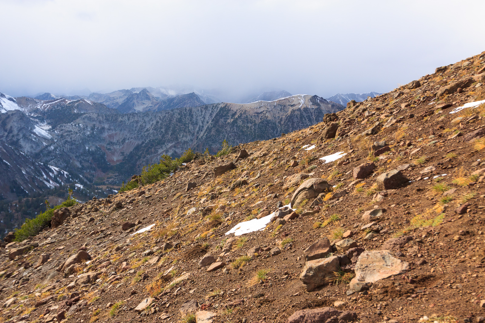 During the first half of the climb, we had an open forest of short trees for support. When we rose above the treeline, we were already above 9000 feet. But by that time, I had noticed the mountains to the west disappearing one by one into a storm. I called out to those ahead of me to reconsider our plan. Finally, when all but the adjacent ridge had disappeared, they decided to turn back. With no way of gauging just how bad this storm could be, I was not going to take any chances with bad weather on a mountain summit. We descended with snowflakes falling upon us.