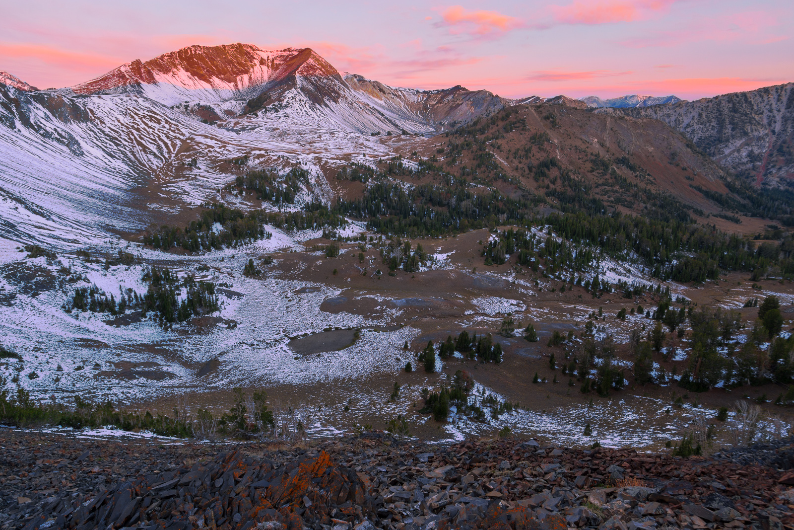 The morning was cold, but worth the effort. Most everyone decided to climb the ridge behind camp to watch the sun rise. I stayed down below mostly because I didn’t feel like exerting the energy to get up there. The light quickly descended and warmed us up as we made breakfast and coffee and packed up our gear. We left at 9:30 and headed back the way we came. Monday was sunnier and warmer than Sunday. The remaining snow was quickly melting away as we hiked down into the valley. I stopped for a couple of reflection shots on the glassy mirror-like surface of Bonny Lake. Otherwise, we made good time, getting back to the car shortly after noon. We finished the weekend with our traditional beer and burger at Terminal Gravity.