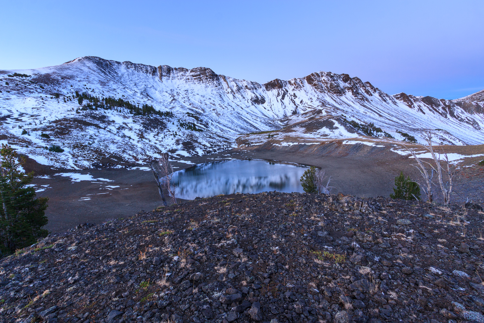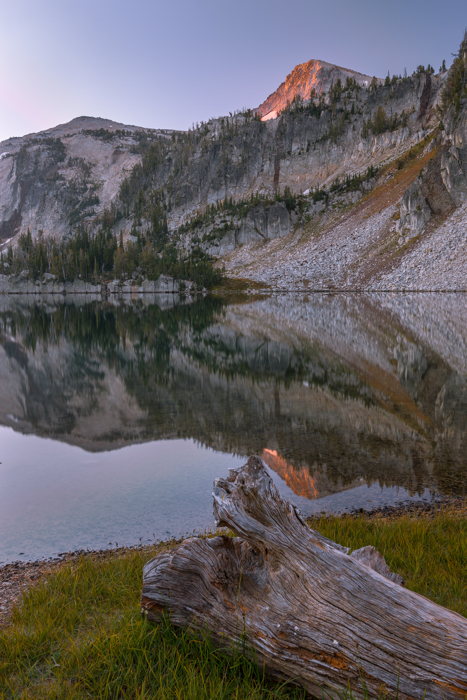 The morning was cold, but worth the effort. Most everyone decided to climb the ridge behind camp to watch the sun rise. I stayed down below mostly because I didn’t feel like exerting the energy to get up there. The light quickly descended and warmed us up as we made breakfast and coffee and packed up our gear. We left at 9:30 and headed back the way we came. Monday was sunnier and warmer than Sunday. The remaining snow was quickly melting away as we hiked down into the valley. I stopped for a couple of reflection shots on the glassy mirror-like surface of Bonny Lake. Otherwise, we made good time, getting back to the car shortly after noon. We finished the weekend with our traditional beer and burger at Terminal Gravity.