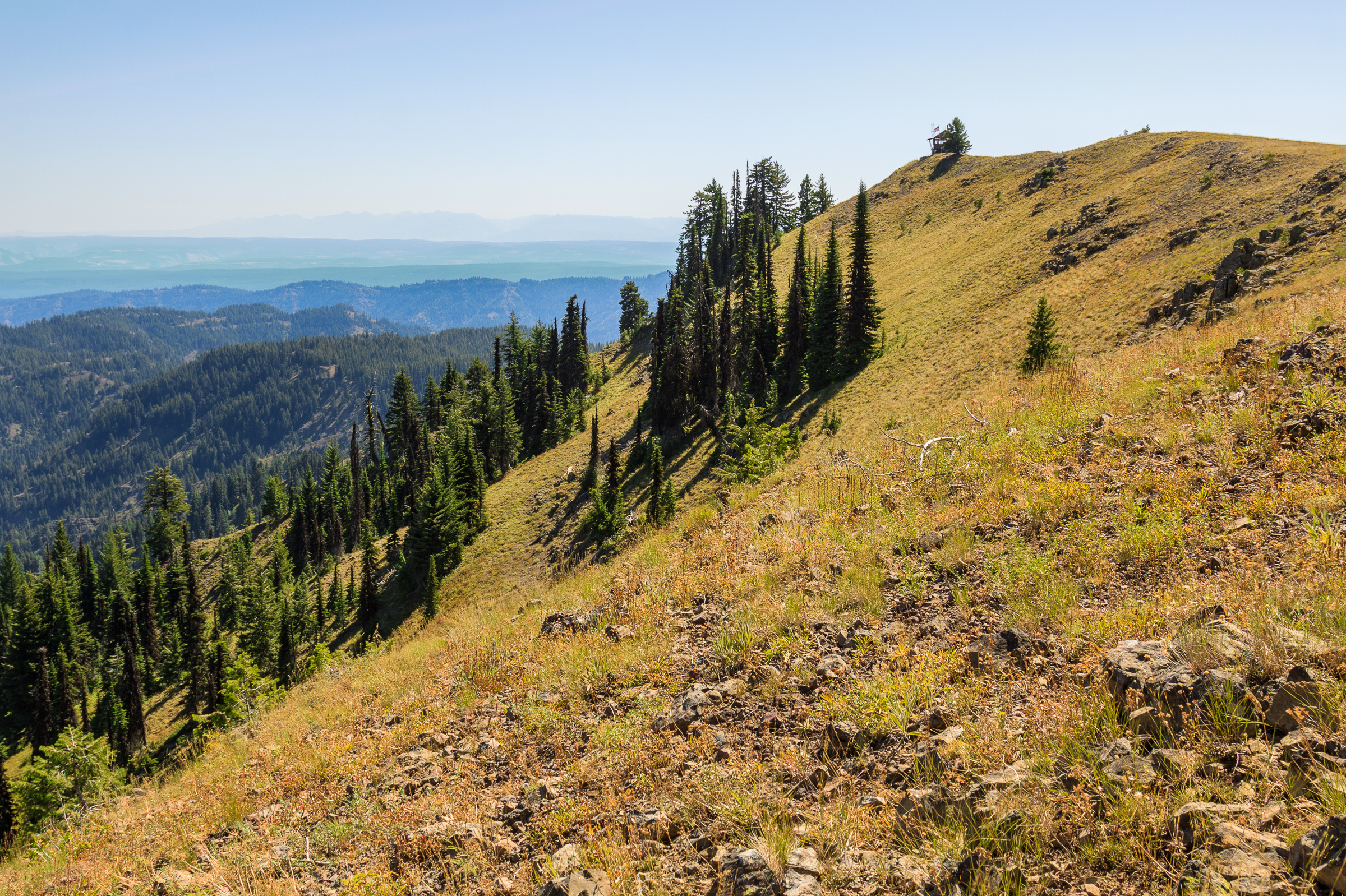 Since my daughter was born a month ago, I haven’t been able to get out and stretch my legs on the trail. So when an opportunity came along to go hiking, I jumped at it. The past few weeks had been miserably hot, even to the point where escaping into the high elevations wouldn’t provide refuge from the heat. However, since nights were cool, the early morning hours were a pleasant time to be outside. So one morning, CJ and I hit up Spud Hill in Deary and made it down just in time for the heat to make life uncomfortable. Despite the haze in the air, we could see all the way out to the Wallowas over 100 miles away.