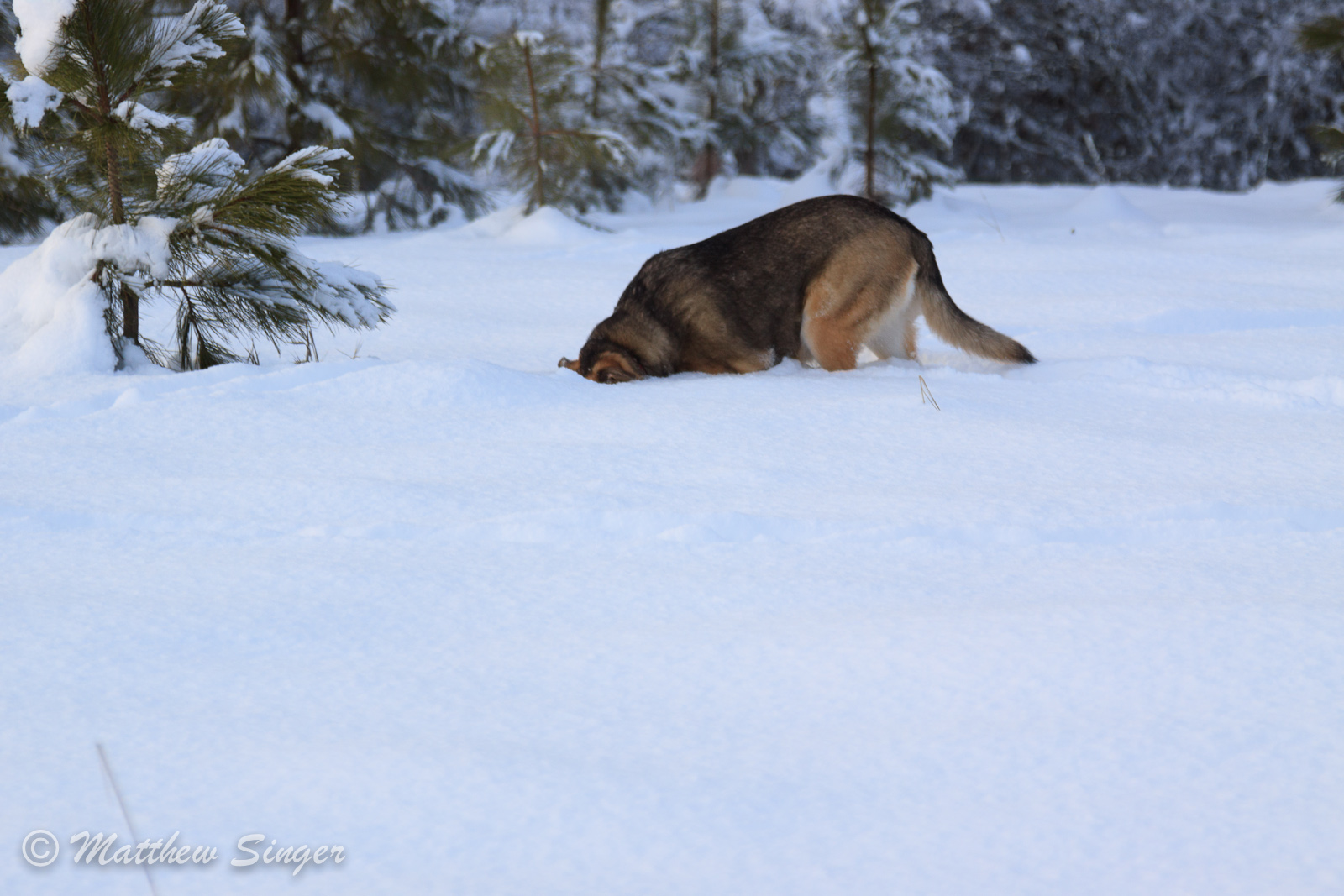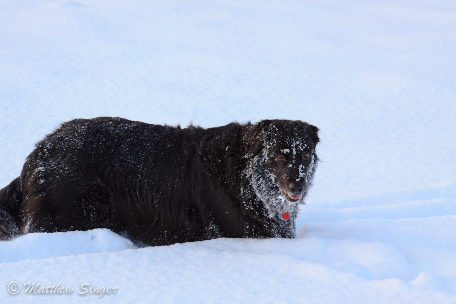 Shadow shows off her beard of snow.Wild dogs, such as coyotes and foxes, are able to hunt even when the snow is six feet deep. Greta likes to pretend she is a wild dog.