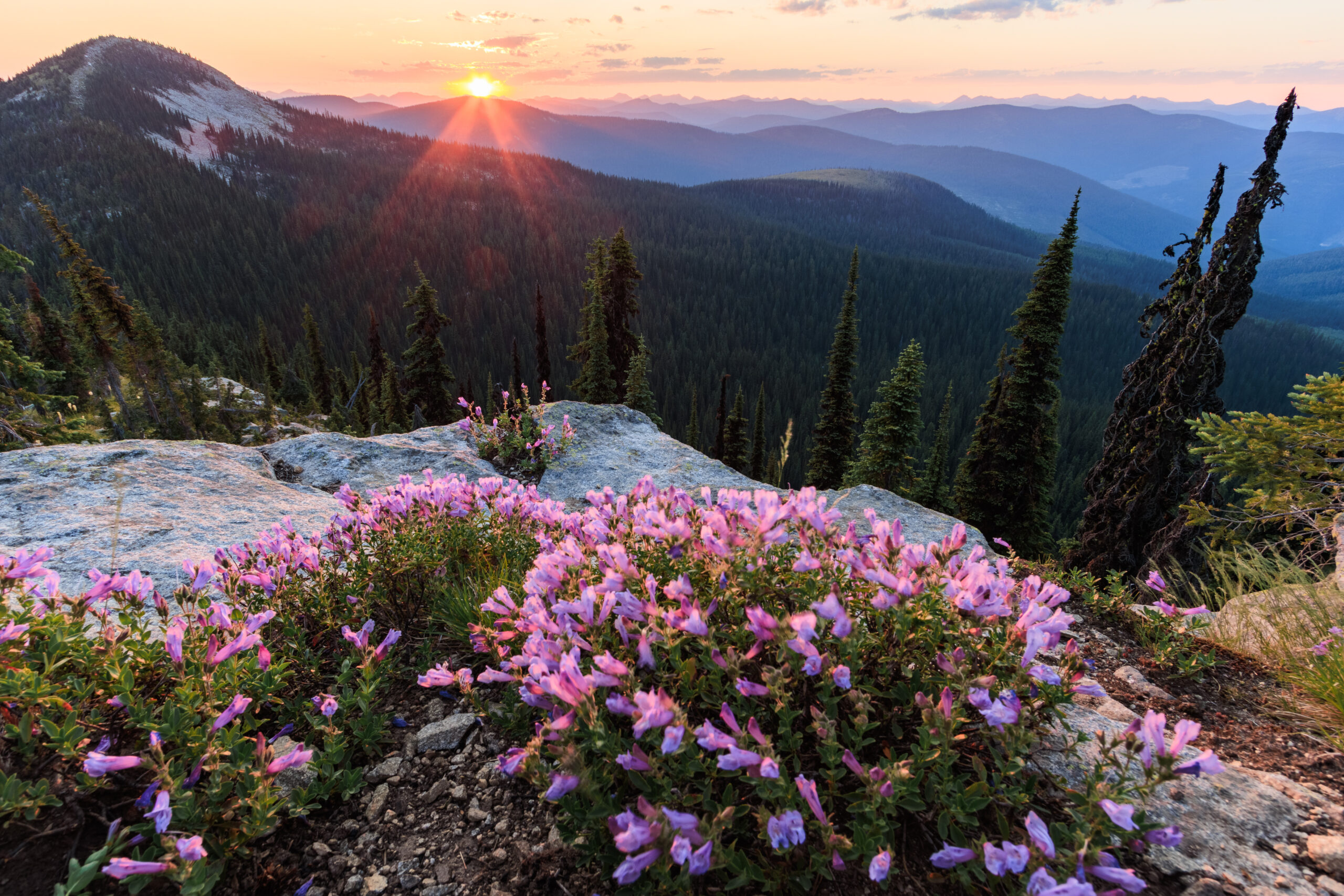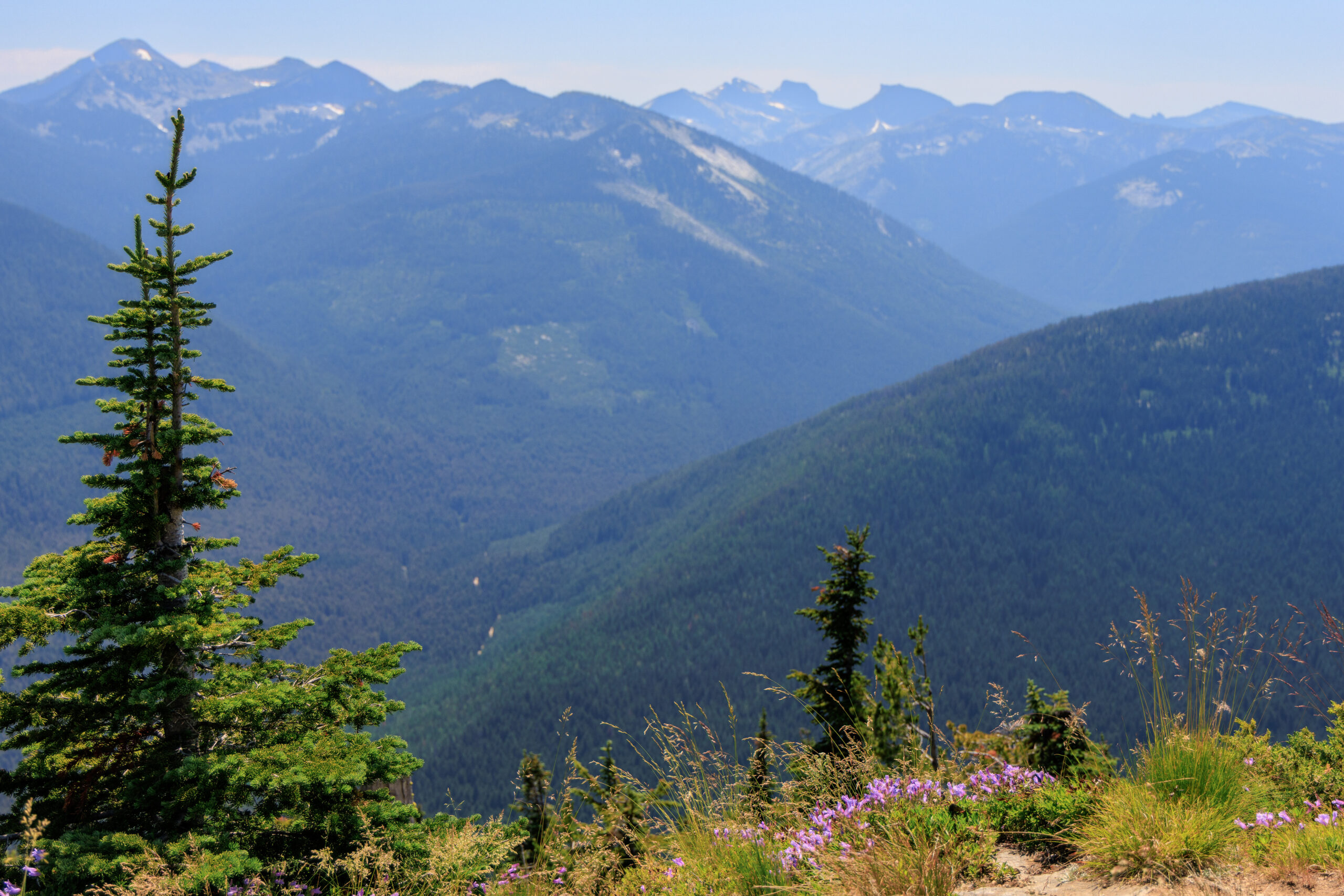 Shorty Peak tops out at an elevation of around 6500 feet above sea level with a view that is as spectacular as it sounds. The mountain is located in Idaho’s Selkirk Mountains on a ridge adjacent to the ridge that hosts the US-Canadian border. When Heather found that someone was unable to use their reservation, she quickly jumped on the opportunity and we were soon heading up the winding forest service road to the trailhead. On paper, the trail isn’t bad – 2.5 miles to the lookout with an elevation gain of 1300 feet. However, two challenges made this hike feel tougher than it was. First, neither one of us had backpacked in years, and so we were not used to carrying so much weight. Second, There is no available water at the lookout, so our packs were exceptionally heavy having to carry all of our water with us. Now, I have since learned that there is a spring about half a mile and 500 feet down from the lookout, which isn’t much better for collecting water. Either way, it’s not easy. We also happened to go in the prime of mosquito season, and we were surely getting eaten alive on the hike up. But the mosquitoes all but disappeared as we emerged from the forest to the bald summit.