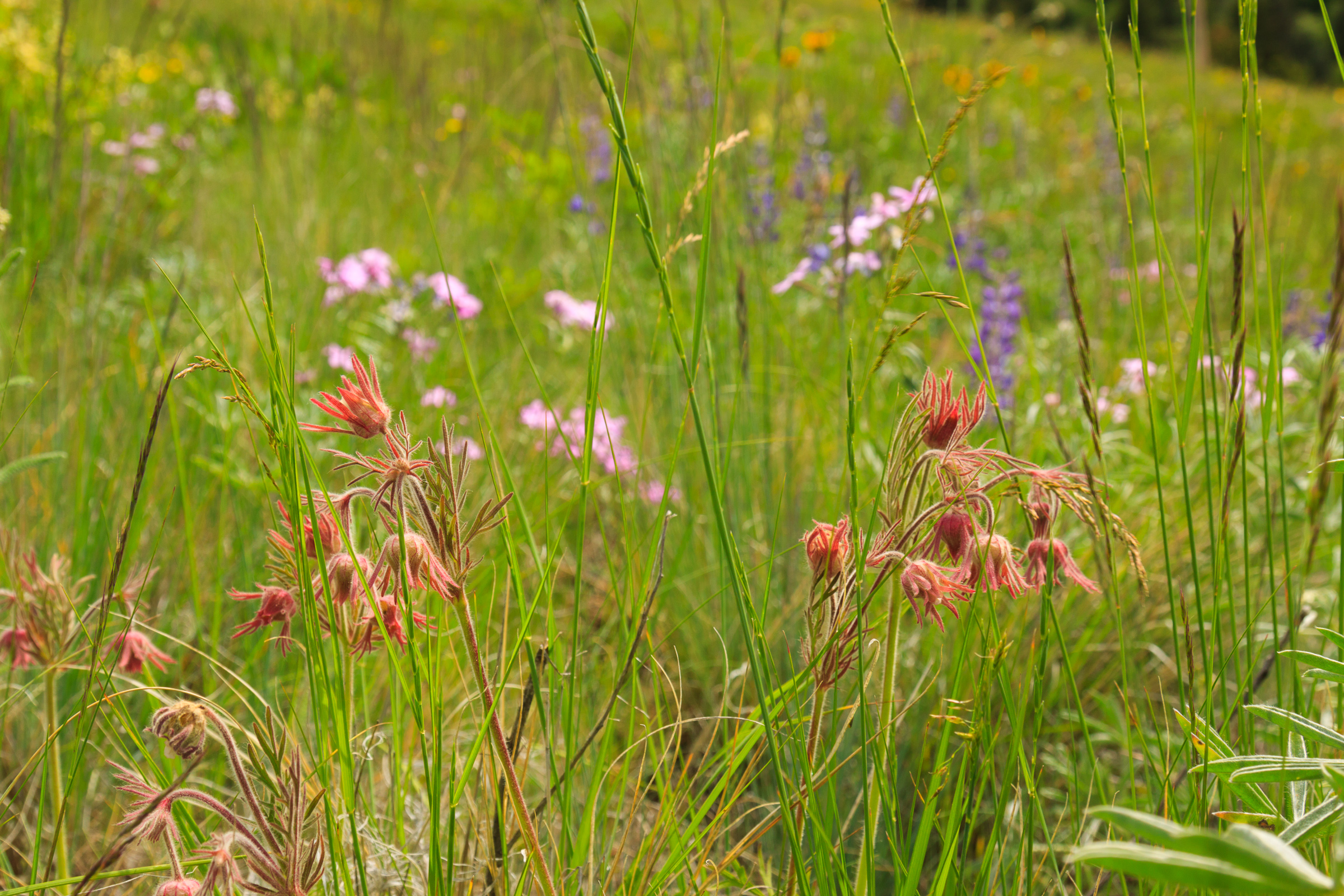 For Memorial Day weekend, Waha Lake was decidedly uncrowded. It’s a small lake in the mountains south of Lewiston. There is a small municipal park at one end that serves as a campground. There’s nothing special about it, but the camping is free and it seems like a nice place to just get away for a night. The cache “Broken Top” sits near the summit of one of the “peaks” near the lake. You could probably access it directly from the lake via ATV trails, but we opted to drive up to the Idaho Fish&Wildlife parking area. The road up to the “trailhead” is amazing. As you ascend, you can look over the Lewiston-Clarkston valley and onto the palouse. This time of year, it transverses some open meadows that are full of wildflowers. It was during one of these that I noticed the Prairie Smoke. I stopped the car and we got out to look closer.