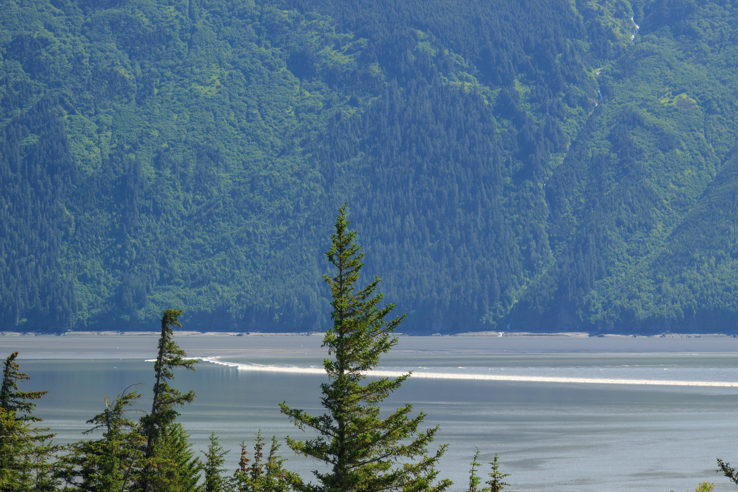 I left Anchorage and headed down for Seward. It’s only a 120 mile drive, but I left myself all day to stop and explore, and I still ran out of time. I thought I’d stop along the way and hike, but instead had too much fun at the many road-side stops along the Cook Inlet (pictured above). One of these stops was Bird Point, a popular place to watch the tidal bore come in. Cook Inlet is the only place to see a tidal bore in the United States and it produces some of the largest bores in the world with waves as high as six feet. The 15th was predicted to be a good day for bore viewing, and while I didn’t get a six-foot wave, it was still quite noticeable.
