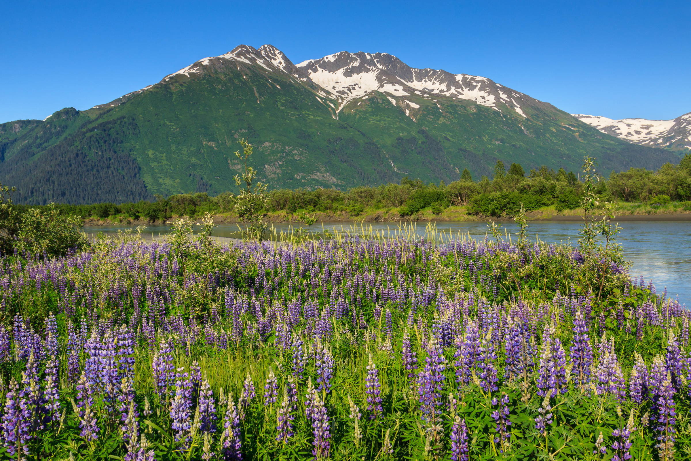 The Bore came in fairly late in the afternoon around 4:20pm. For Alaska, that doesn’t really matter. Sunset in Anchorage this time of year was 11:30, and the night never really gets dark enough to see the stars. As a result, it’s not hard to stay out late and forget to sleep. But the hostel I was staying in required I check in by 10:00 pm, and it was 7:00 by the time I reached Portage at the end of Turnagain Arm. With road construction, I was still about 2 hours away and needed to get into town with enough time to get some dinner. So I reluctantly continued the rest of the drive without any stops. Well, I made one stop. I found a patch of lupines next to one of the river outlets which was irresistible for a photograph.
