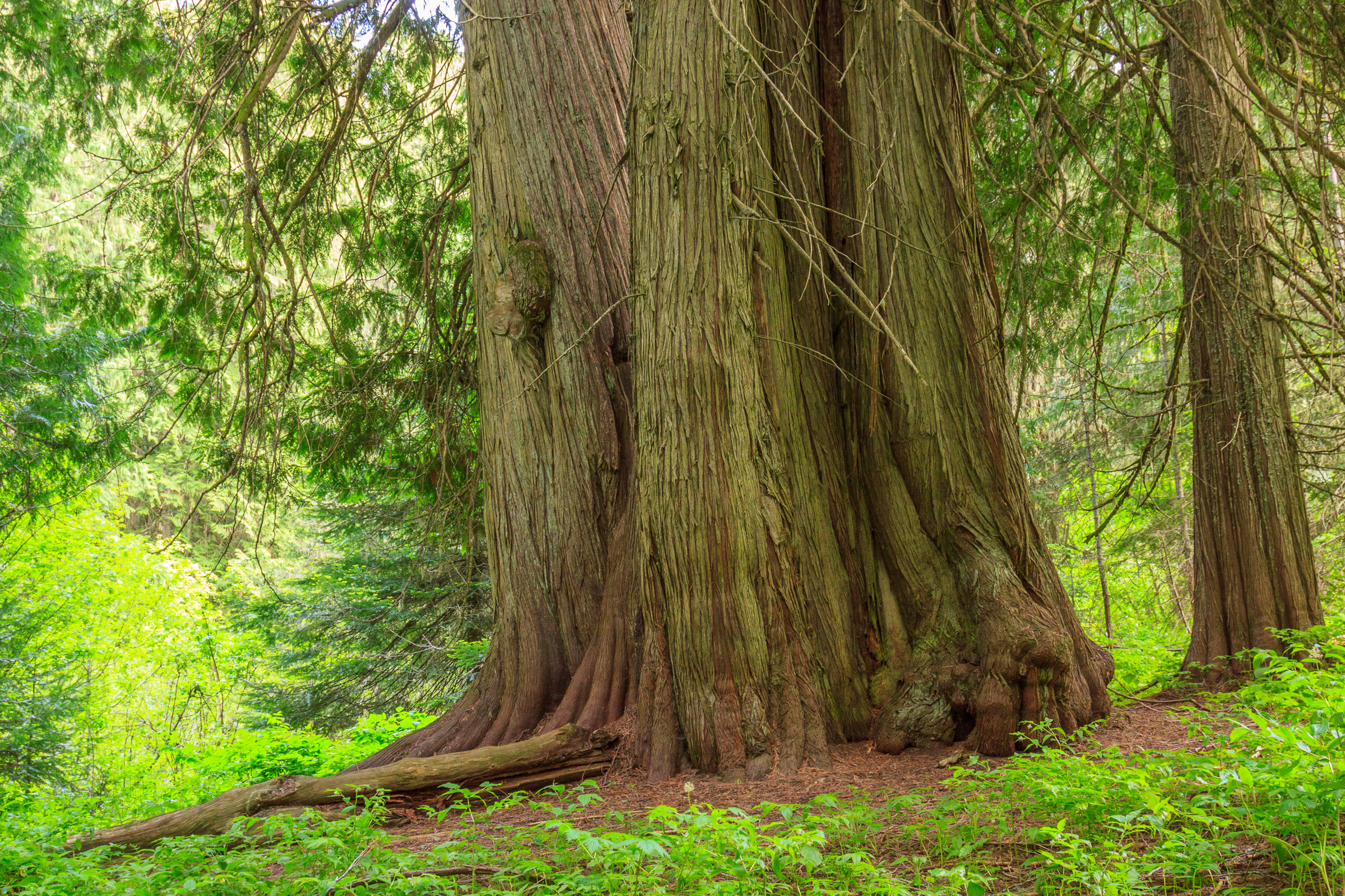 Both the lookout and the cedars are about 2 miles (give or take) from the lower parking area. When you hit the turn off to go to the lookout, instead continue straight on the road for another half mile until you reach what looks like a pull-off on your right. There you’ll see a trail enter the woods marked by two metal poles. Follow this trail about .2 miles into the heart of the old-growth cedars. There, you’ll find a picnic table surrounded by many impressively sized trees. You won’t find as many large trees as you would at Elk River or the Hobo Cedar Grove, but you’ll find some solitude and awe among some giants that rival the ones at the other groves.