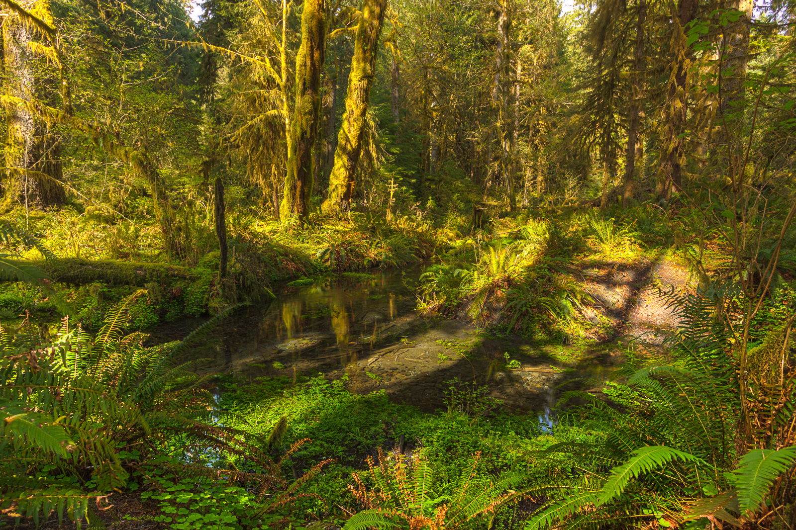 After a nice morning at Sol Duc, we drove out to Forks where we stopped for lunch and a re-stock on food for camping. By the time we made it into the Hoh Rainforest, the sun had come out in full force. The rainforest is quite a stark contrast with the forests of northern Idaho. For one, the humidity in the air is above 80%, on par with life in the southeast. On this April day, temperatures rose into the high 70’s or low 80’s. On all accounts, it was beautiful weather, except for photographers. In the forest, full sunlight creates high contrast conditions that are incredibly difficult to deal with. Either you keep details in the shadows and get highlights that are blown out where the sun is shining, or you get good exposure for the sunlit spots, but everything else is nearly black. I spent some time taking multiple exposures to blend together in Photoshop using the built-in HDR tools. I think this compromise worked well, though I still would have liked overcast and even rainy conditions.