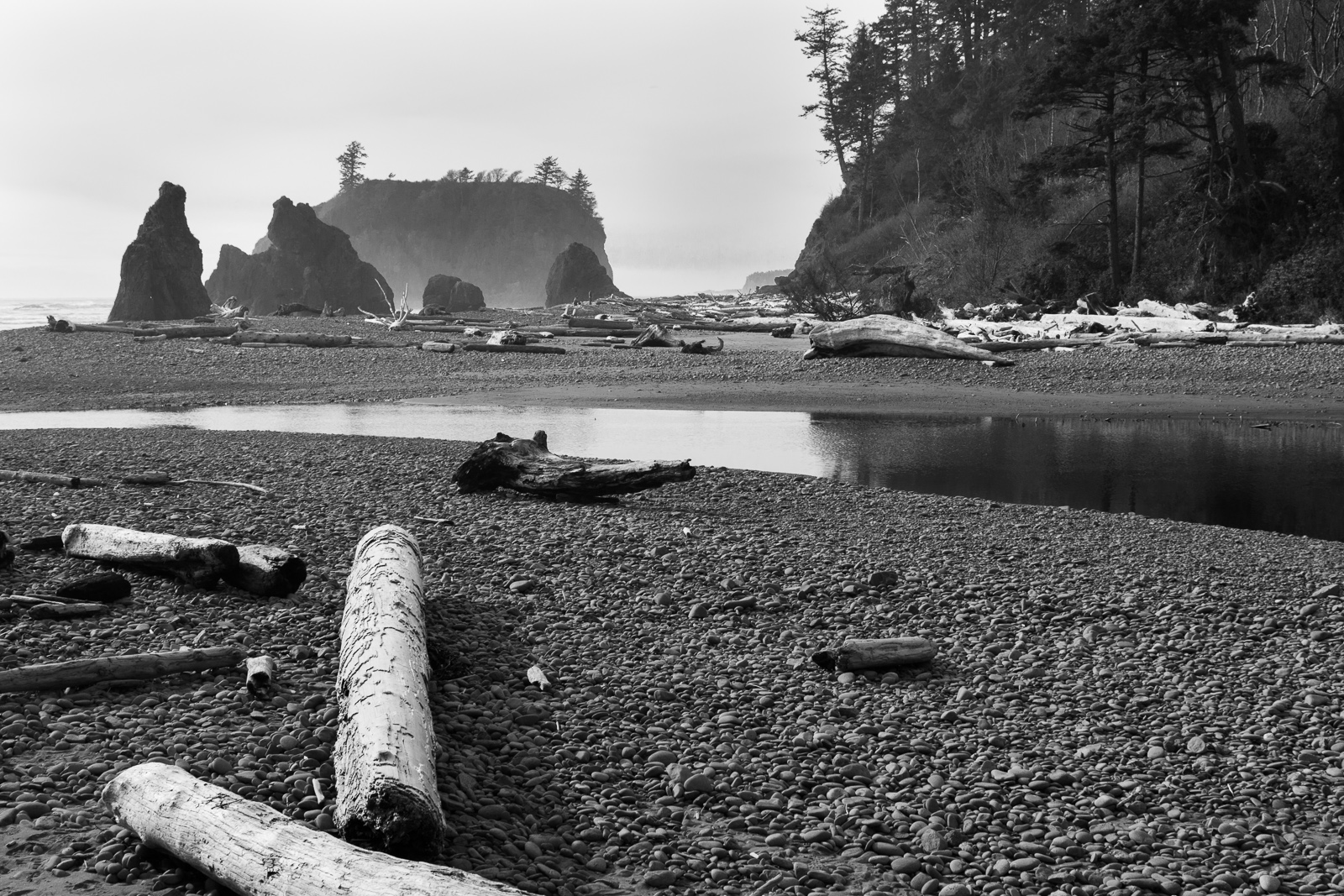 After spending some time at the Hoh Rainforest, we headed out for Quinault lake where we planned to spend the night. On the way, we stopped for a brief leg-stretch at Ruby Beach. Like the Dungeness Spit, the coastal beaches on the Pacific are full of giant driftwood logs. The beach is a rock beach below a cliff. Sea stacks rise like pillars from the waves. On a longer trip, we would have spent a whole day on the coast, but we were in a rush to set up our campsite before dark.