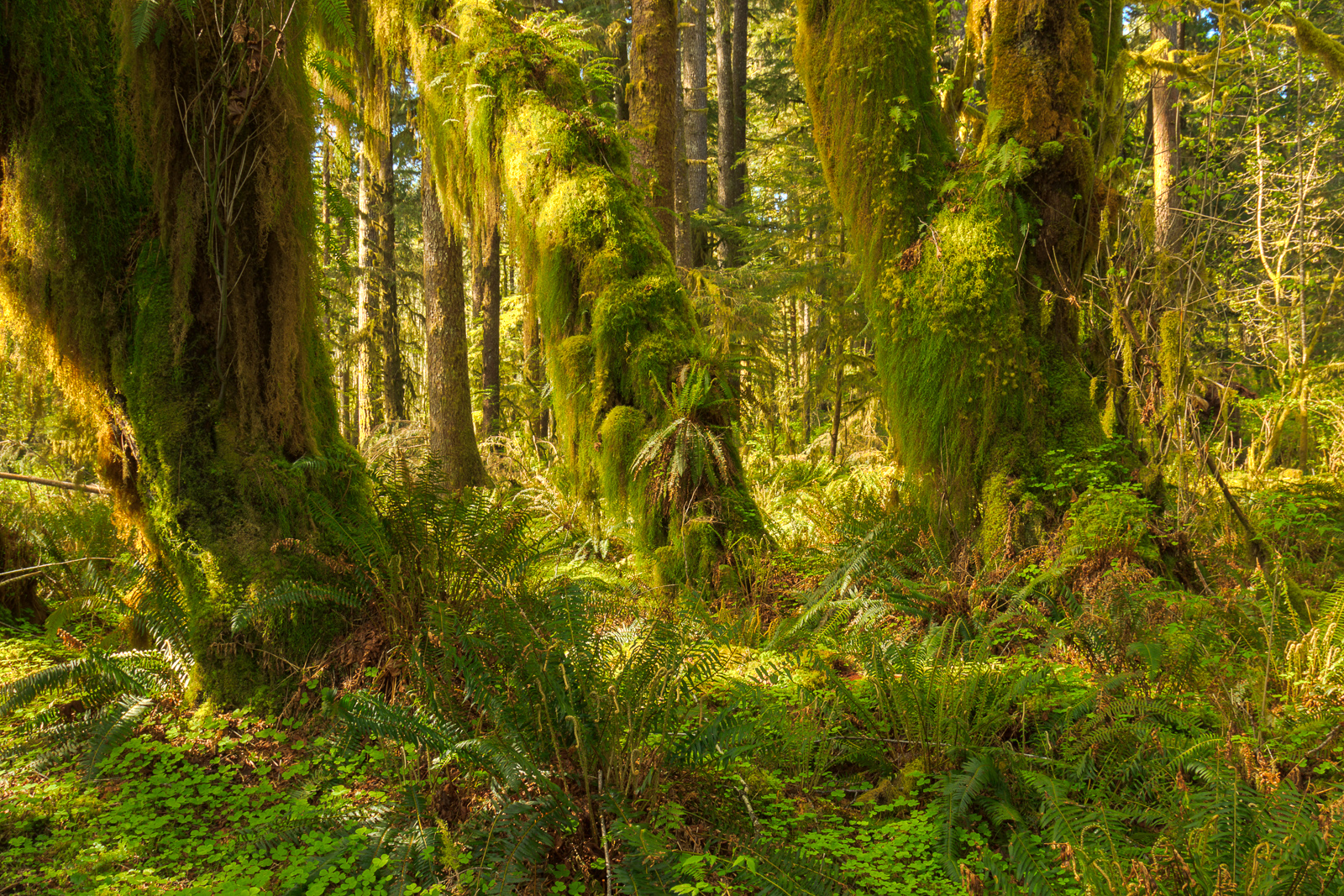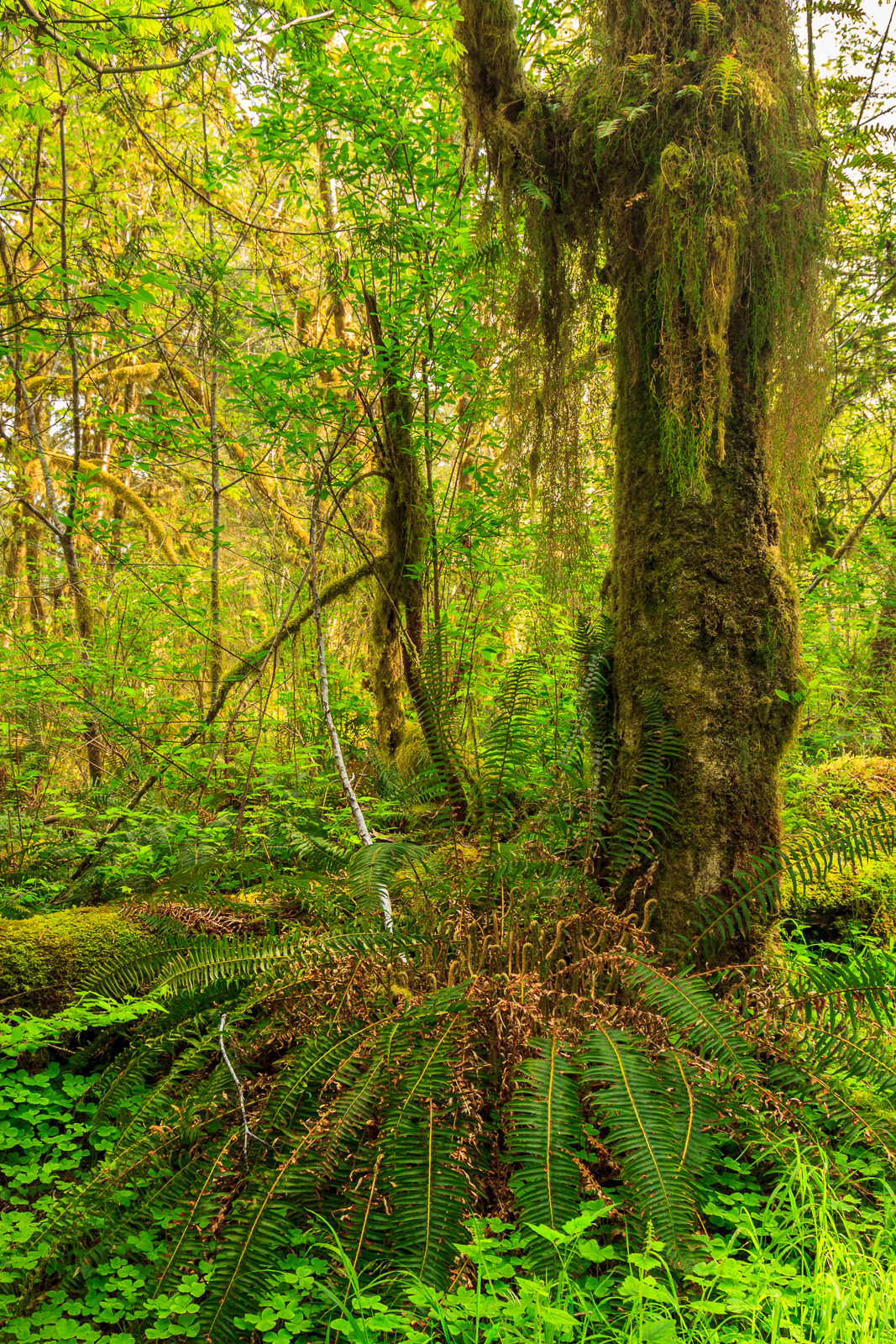 The Hoh Rainforest is unlike any forest I’ve been in. In addition to the huge old-growth spruce, fir, and cedar, the forest is full of maples. These trees are covered from top to bottom in epiphytes. A blanket of moss covers every open surface, and that creates a substrate for ferns to grow. Seeds from the larger trees might not even make it to the ground, instead settling among the epiphyte communities and sprouting mid-way up the trunk of an existing tree. Those that die and fall over are quickly overrun with new plants. These nurse logs serve as nutrients for a new generation of forest dwellers. It’s not uncommon to see a row of large trees with a hole in their base where the nurse log once nourished them.
