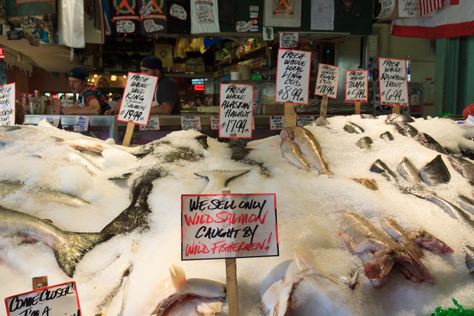 Once we were done with the fish, we headed up to Pike Place market to check out the shops. This is like a full-time farmer’s market with fresh meat, fish, and fruit & veggie stands, plus a few restaurants and other artisan food shops. The lower levels are like a shopping mall, but the stores are locally owned shops instead of corporate chains. It’s both touristy and a legitimate local shopping hub.